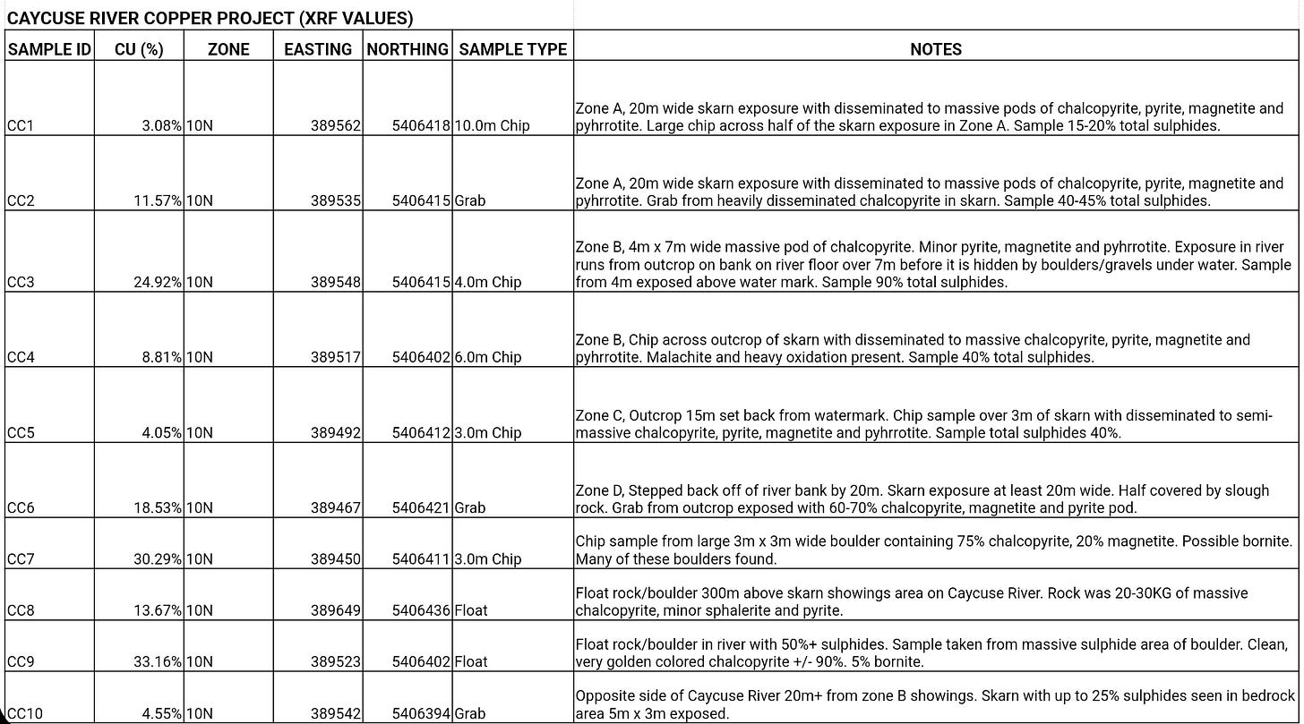 Sample results include bedrock chip samples with 8m of 8.81% cu, 4m of 24.92% cu, 10m of 3.08% cu, 3m of 4.05% cu. Additionally large boulders of skarn can be found down river showings from the showings. A 3.0m chip from a boulder had 30.29% cu and a grab sample of 33.16% cu.