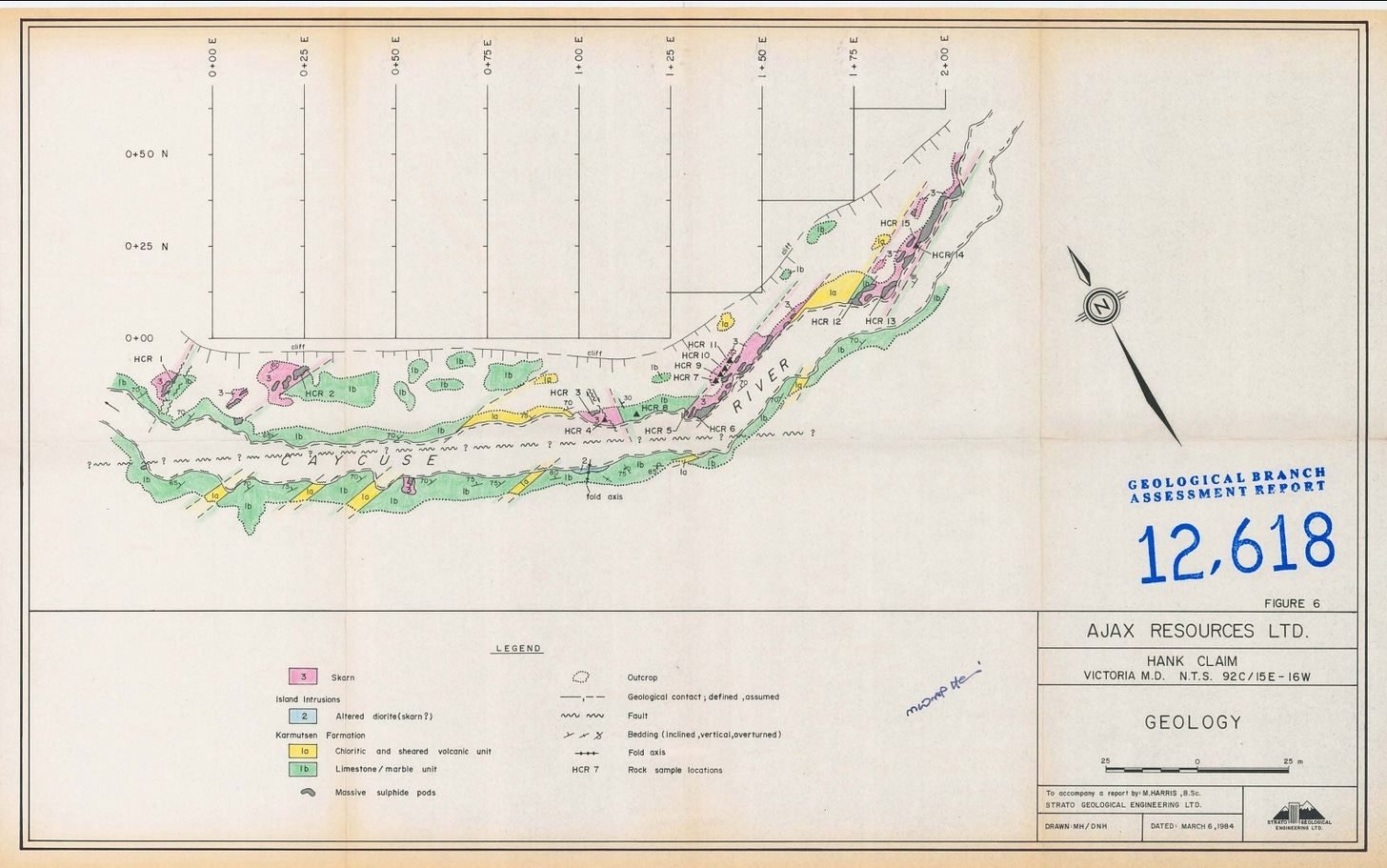 The showings are skarn hosting sulphides disseminated to massive pods of predominatley chalcopyrite with secondary magnetite and pyrite. There are four skarn zones with a combined 275m of showings associated with the minfile. Below is a map by Ajax Resources Ltd, from assessment report 12,618.